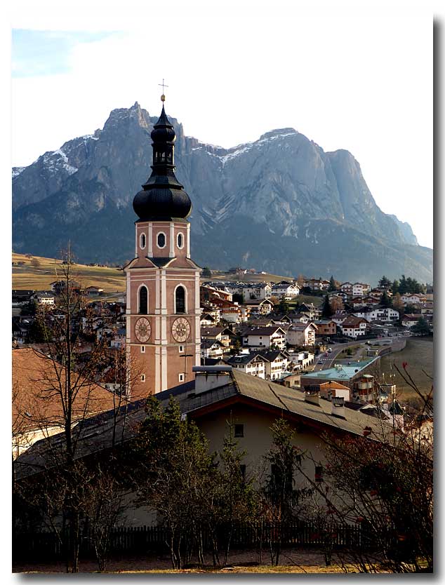The steeple of the Church of Kastelruth / Castelrotto.